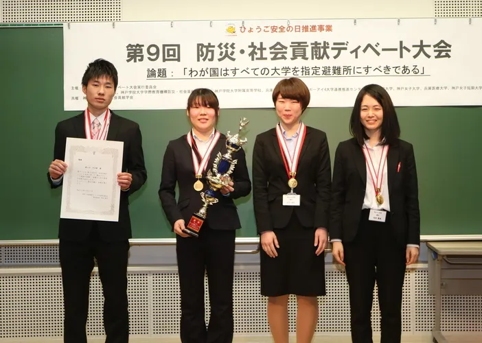 第9回防災・社会貢献ディベート大会(兵庫県、本学防災・社会貢献ユニットなどによる実行委主催)が17日、ポートアイランドキャンパスで開かれ、現代社会学部社会防災学科、中田ゼミ2年次生のチーム「第三代中田家」(段ノ上晴樹さん、毛利夏実さん、橋本有里さん、足立桃花さん)が優勝しました。