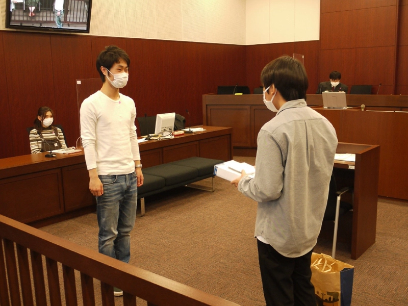 屋外のメインステージでは学生放送局の林田田さん(経済学部3年次生)と岡本光司さん(現代社会学部2年次生)が司会を務めました。チアリーダー部のパフォーマンスがあり、課外活動団体の紹介、ハロウィーンにもちなんだ仮装大会、のど自慢大会などの出し物が続きました。各教室でも学部など主催の展示・イベントがあり、B号館1階の法廷教室では模擬裁判がありました。副学長の角森正雄法学部教授から法廷教室や模擬裁判についての説明がありました。原告、被告、裁判官、代理人、証人はすべて法学部の学生が務めました。裁判の概要を書いた資料は配布しましたが、さらに分かりやすく学生が寸劇で説明しました。傍聴席には多数の来場があり、裁判の行方や判決を興味深く見守りました。