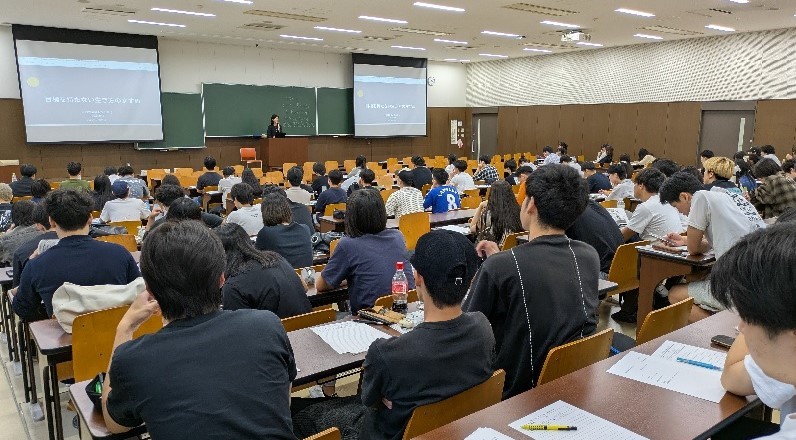 第1回の講義は、元みなと銀行学園都市支店長の内堀佐智子さんが、「目標を持たない生き方のすすめ」と題して、自らの就職の経験、銀行での業務、支店長への道、長年勤めた銀行を退職して新しい道を歩み始めたことなど、自らを振り返りながら、長期的な目標を固定してしまうのではなく、短期的な目標を修正しながら進んでいく人生の歩み方を熱く語りました。今年度は昨年度に続き、2学部合わせて150人近くの受講生が熱心に講義に耳を傾けました。