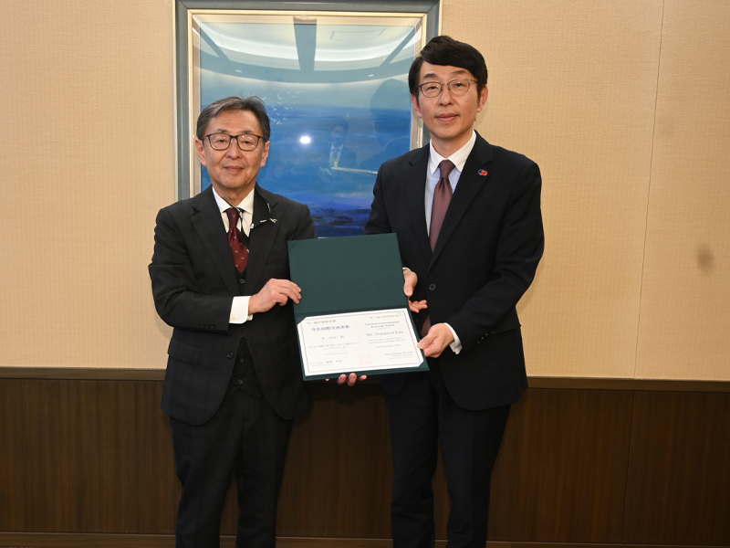 表彰を受けた1人は駐神戸大韓民国総領事館の李相烈(イ・サンヨル)総領事です。共通教育科目として企画された「総領事館連携講義」で2023年と2025年に日韓(韓日)の長い友好の歴史などについて講義していただき、2022年から始まった同総領事館主催「韓日大学生、友情の出会い」では毎回参加している本学の学生に貴重な助言をいただきました。国際交流センターが今年2月に実施した「韓国の服装(ハンボク)に着替えよう」と題した韓国文化の体験会にも参加いただきました。