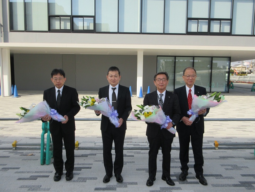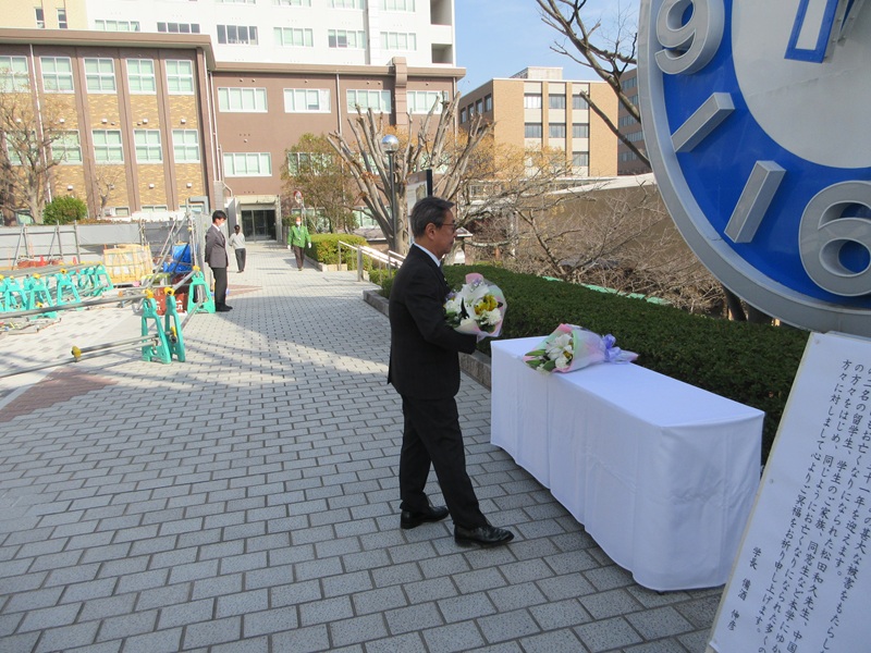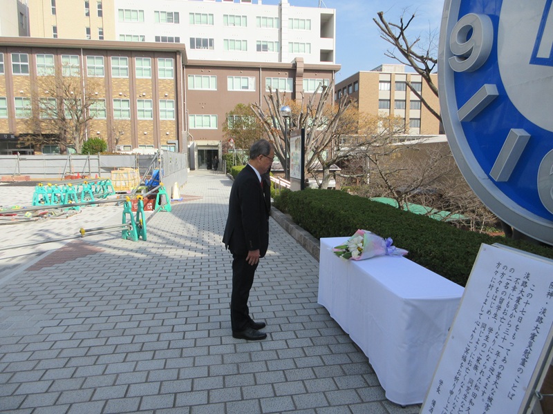 4人は西本誠實理事長と備酒伸彦学長、住本武司法人事務局長、高山修大学事務局長です。献花台の横には備酒学長による「阪神・淡路大震災慰霊のことば」が掲示され、「不幸にもお亡くなりになられた松田和久先生、中国からの二名の留学生、学生のご家族、同窓生など本学にゆかりの方々をはじめ、同じようにお亡くなりになられた多くの方々に対しまして心よりご冥福をお祈り申し上げます」と書かれています。