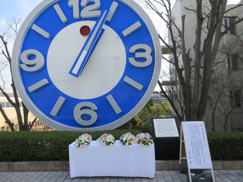 阪神・淡路大震災から31年を翌朝に控えた1月16日、震源に近い有瀬キャンパスでは、学校法人神戸学院と神戸学院大学のトップ4人が中庭の大時計前に設けられた献花台に慰霊の花を手向け、犠牲者に黙とうを捧げました。