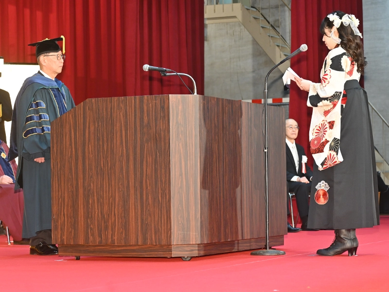 式辞を受けて、卒業生・修了生を代表して栄養学部卒業生の髙谷梨暖さんが答辞を読み、「3年次生からは給食センターや学校など学外での実習に参加し、人々の生活に食がどれほど大きな影響を与えているかを知りました」と述べました。またマラソンランナーの栄養補給などのために3年次生が企業と連携して考えた「マラソンレシピ」の開発を記憶に残る学びとして取り上げ、「ラジオやイベントにも出演して相手を思いやること、専門的知識を伝えることの大切さを学びました」と振り返り、友人、家族、恩師への感謝の言葉で締めくくりました。