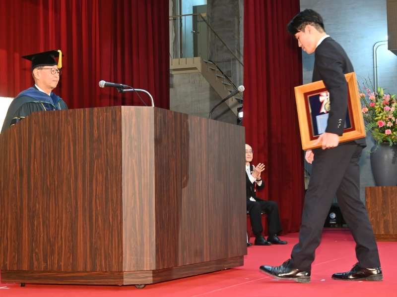 各学部や大学院研究科の総代が演壇に上がり、備酒伸彦学長と各学部長、研究科長から学位記を授与されました。続いて表彰に移り、佐々木勝啓さん(法学部、スポーツサイエンス・ユニット、バレーボール部)が「体育活動などで本学の栄誉を高めた」として、また、田中陽大さん(経済学部)、西村星哉さん(人文学部)、今井文蒔さん(心理学部)、玉田千晴さん(総合リハビリテーション学部)、山根佳奈さん(栄養学部)が「成績優秀で他の学生の模範になった」として、計6人の卒業生に学長賞が授与され、代表して佐々木さんが楯(表彰額)を受け取りました。