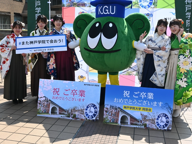 バス停前では同窓会がお祝いの撮影ブースを設置し、「卒業・終了後は各地の同窓会支部が皆さんのお力になれます」と呼び掛けました。新調したのぼりが立てられ、大学の公式キャラクター「マナビー」と一緒にと記念撮影するなどして卒業生や修了生の人気を集めていました。