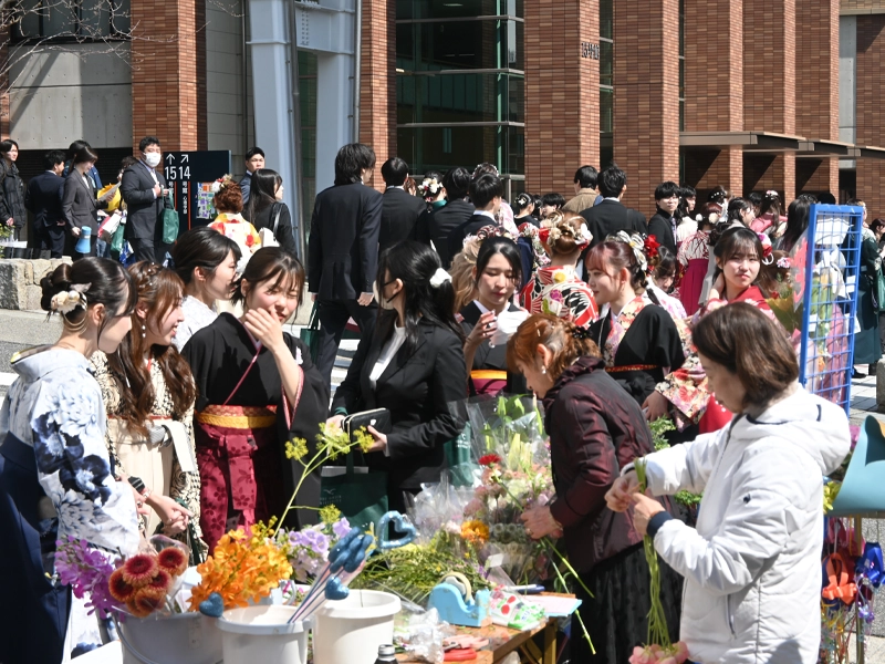 式典が終わると、学部やゼミごとに分かれて学部表彰や学位記授与、卒業・修了記念の行事などがありました。新年度からオープンする有瀬1号館(愛称ARISE=あらいず)の真新しい学舎やシンボルの大時計、正門前などでは晴れ着姿で同級生や家族と写真撮影する姿が目立ち、親しんだキャンパスや仲間、恩師との別れを惜しんでいました。