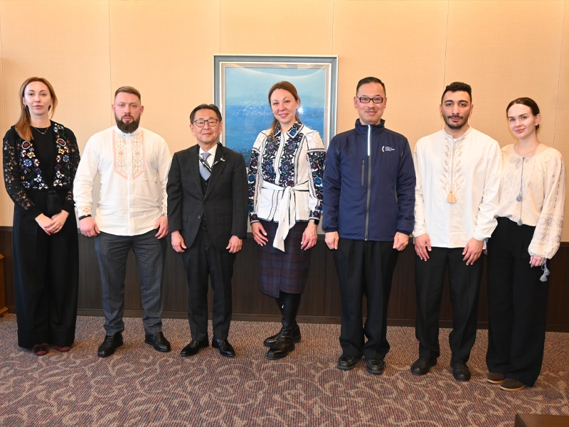 この後、一行は備酒伸彦学長を表敬訪問し、プリホドコ副大臣がさまざまな分野での支援を必要とする祖国の現状を詳細に説明しました。備酒学長は厳しい状況を聞いた後で、戦争の終結と平和への期待を込めて「人には必ず再生があり、再び栄光があるはずです」と述べました。