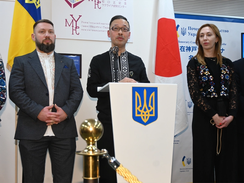 名誉領事館に隣接する松口正記念ウクライナ研究センターで開かれた歓迎レセプションでは行政、経済界、JICAやウクライナを支援する議員や市民などが一堂に集いました。国歌「ウクライナは滅びず」を全員で斉唱した後、岡部芳彦名誉領事(国際交流センター所長)が歓迎のあいさつで、「持続可能な復興のためには多様な背景を持つ人材が必要であり、インクルーシブ社会の実現をめざす訪問団の研修には大きな意義があります」と述べました。