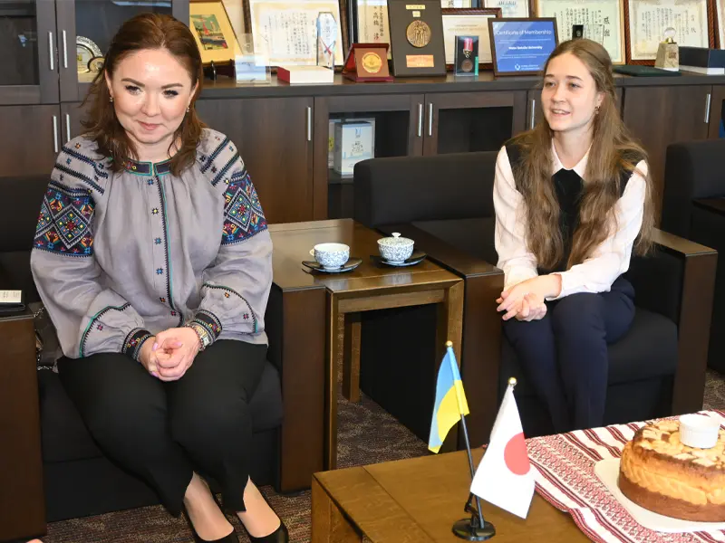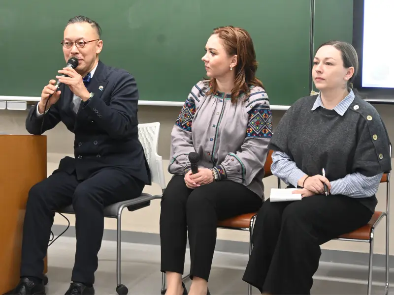 ミハイリューク議員は元大学教授で法学博士です。本学には国会議員団の団長としてロシアによるウクライナへの軍事侵攻があった2022年の10月にも訪れ、有瀬キャンパスで学生に侵攻から8カ月後の状況を語ってもらいました。今回は12月22日に来日し、東京で政界の要人と面会して戦時下の協力に感謝、引き続き支援を要請した後、神戸に足を延ばしました。