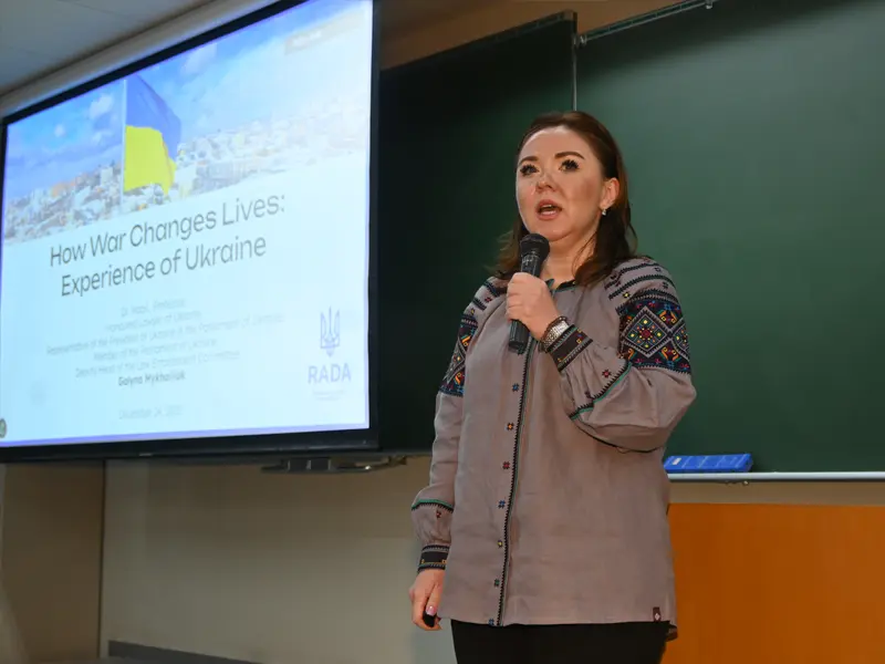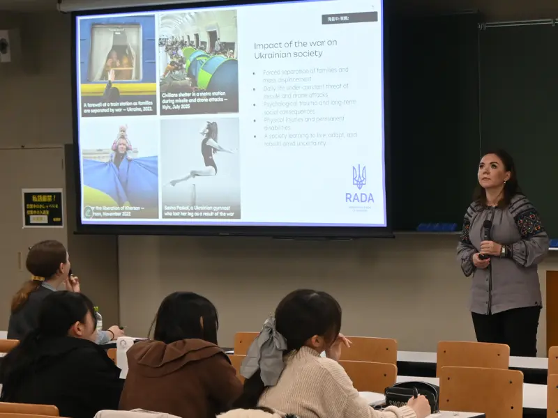 講義のテーマは「戦争はいかにウクライナの経験を変化させたのか」。大きな拍手に迎えられて登壇したミハイリューク議員は「日本の皆さんの人道的、経済的支援により、何十万人のわが国民を救うことができました。感謝しています」と述べました。