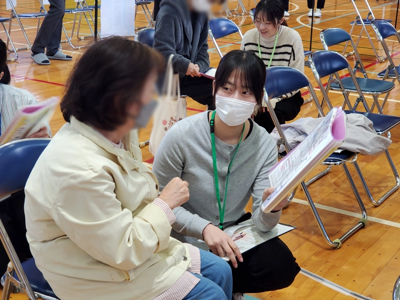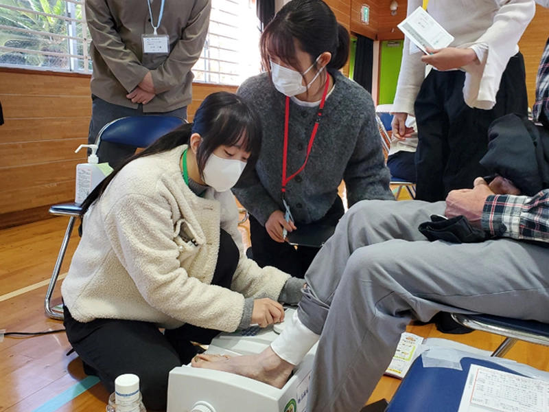 測定会に参加した地域住民の皆さんは、「骨密度をしばらく測ってなかったので、今回このような機会で、今の状態を知ることができて良かった」「健康を意識して、普段から歩いたり階段を使ったりして、気をつけていたけど、運動だけではだめなんだと分かりました」などの感想を寄せ、学生の説明を熱心に聞いている姿が印象的でした。