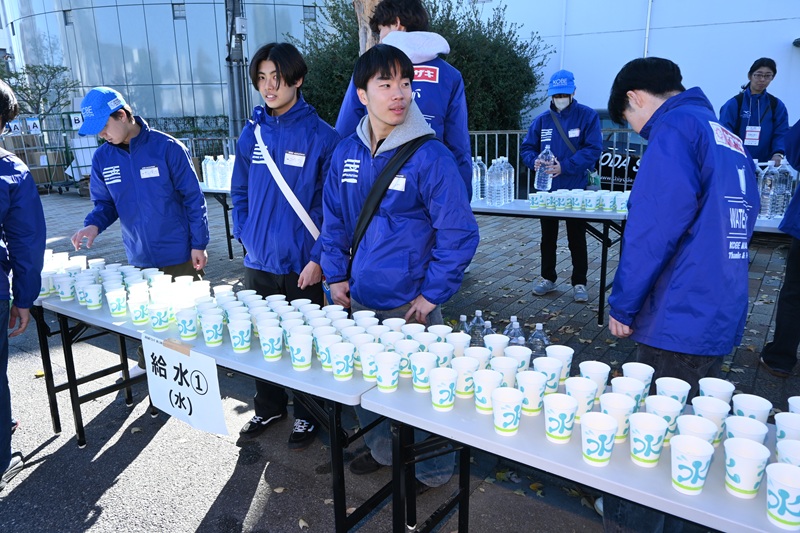応援も入れて総勢600人を超えるボランティアの学生たちは沿道での給水、誘導、救護、固定AED隊としての配置などで汗を流しました。疲れがピークに達するとも言われるスタートから35キロ地点付近、高松橋の給水所では現代社会学部の菊川ゼミ生やボランティア公募に応じた学生計25人が飲料水を注いだ紙コップを丁寧に並べていました。フィニッシュエリアの給水所でも経営学部の辻ゼミと心理学部の難波ゼミの計38人がゴールしたランナーに渡すペットボトルの飲料水を並べていました。