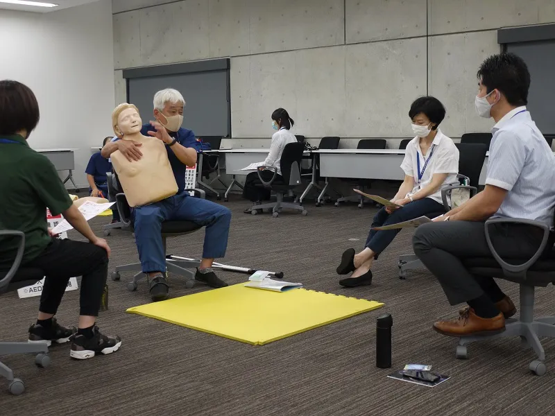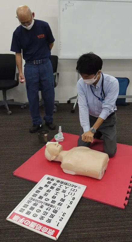 職員約20人が参加。少人数の班に分かれ、神戸市消防局の市民講習担当スタッフから、いざという時の救命方法を指導してもらいました。