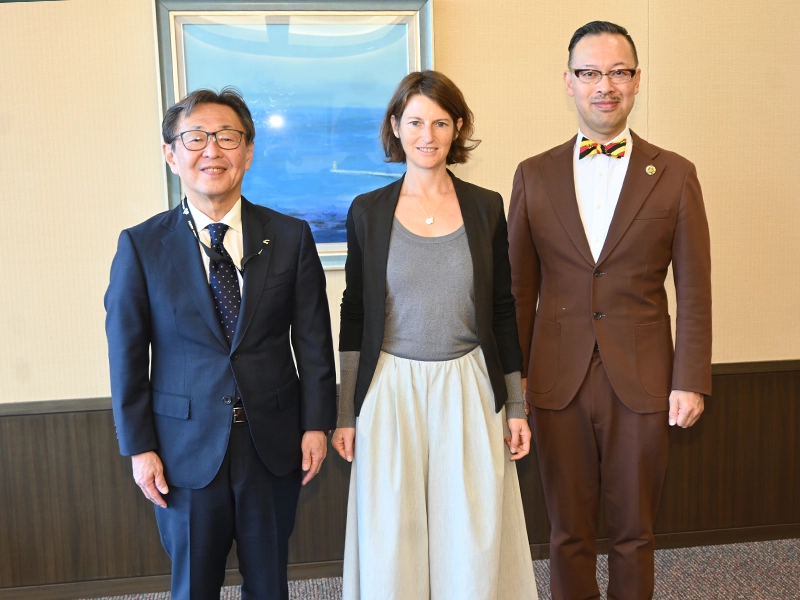 神戸市とハンブルク市は水素エネルギーの利用で協力関係にあり、バイオ医療の分野などでも両国は関係を深めているとのことでした。この半年間の総領事の最大の仕事は大阪・関西万博でのドイツパビリオンの運営とPR。ドイツ館は博覧会国際事務局のサステナビリティアワードを受賞したほか、ドイツ館のテーマ「わ! ドイツ」のイメージを表現したかわいいマスコット、サーキュラーはマスコットたちの人気コンテストで優勝したこともうれしい話題だったようです。