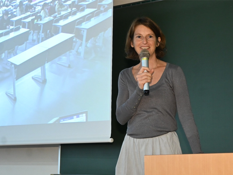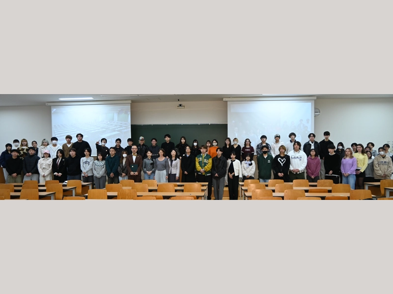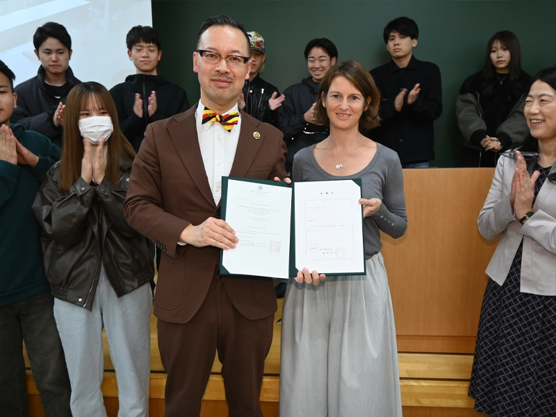 共通教育科目の授業として企画された「総領事館連携講義」で11月26日、大阪・神戸ドイツ連邦共和国総領事館のメラニー・ザクシンガー総領事がポートアイランド第1キャンパスで講義しました。有瀬キャンパスともオンラインで結んで実施しました。