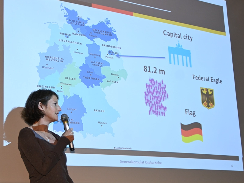 講義はドイツの歴史、現代の国の課題、日本との関係についてでした。神戸に兵庫・大阪ドイツ帝国領事館が開設されたのは1874年。この間、1945年の神戸大空襲による建物の壊滅など苦難と変遷を経て昨年、総領事館としては開設150年を祝ったことを紹介しました。東西冷戦による国家の分裂を経て1989年には東西ドイツを分断していたベルリンの壁が崩れ、念願のドイツ統一が実現したという歴史の節目にも触れました。