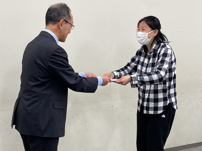 49の応募作品の中から選ばれたのはスヌーピーさん(ニックネーム)の空のグラデーションがとても美しい秋の有瀬キャンパスの写真です。表彰式では生田卓也副学長が表彰状と副賞を贈り、「素晴らしい作品」だと称賛しました。