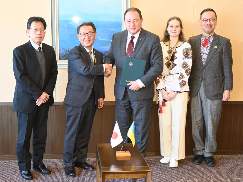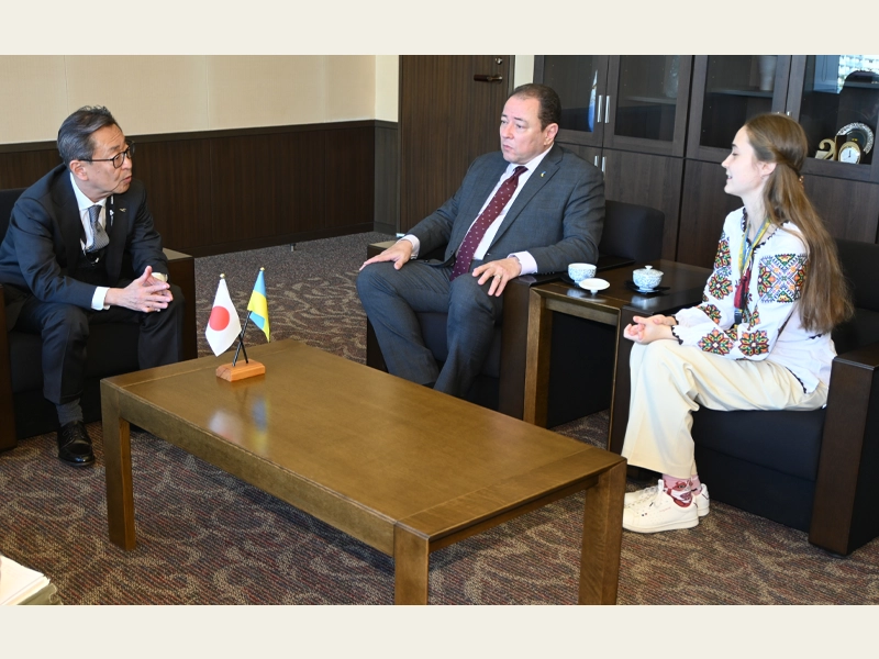 講義に先立ちコルスンスキー前大使は、国際交流センターの岡部芳彦所長の案内で備酒伸彦学長と高山修大学事務局長を表敬訪問しました。教育者は歴代の大使の中で初めてだったというだけに教育の現状などが話題になり、「日本の国立大学の中では留学生の学費を値上げするところが出てきています。これは留学生の数を減らすだけで、望ましいことではありません」などと前大使は述べました。さらに現職に関係するサイバーセキュリティ―についての話題では、日本でもアサヒグループHDがサイバー攻撃を受けて業務に大きな被害が出たことに触れ、「どの企業も完全に安全とは言えません。この分野ではウクライナには対処の経験があります」と述べました。