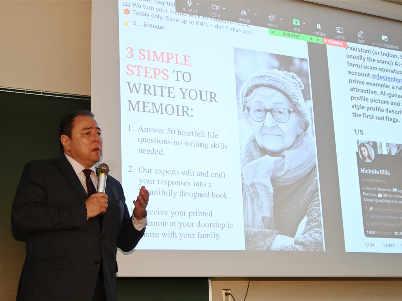 講義はAIの開発競争が国家間の覇権争いの一部になっていることを紹介しつつ、よく言われる「AIが人間を駆逐する」という言説には根拠がないと批判しました。巧妙に個人情報を盗むデジタルサイトが存在するほか、コルスンスキー前大使もあたかも自身であるかのような偽のアカウントを作られて事実とは全く違う言説をまきちらされる被害を受けていることを紹介しました。