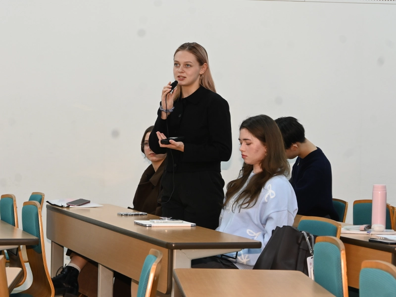 質疑応答に移り、グローバル・コミュニケーション学部日本語コースの留学生は「AIと人間との共存はどうすればいいのでしょうか」と尋ねました。コルスンスキー前大使は「個人個人が批判的思考を身につけることです。AIが有益な場面では使えば良いのですが、何のためにどのように使うかを理解することです。AIはすべて正しい答を出すかというとそれは違います」と答えました。