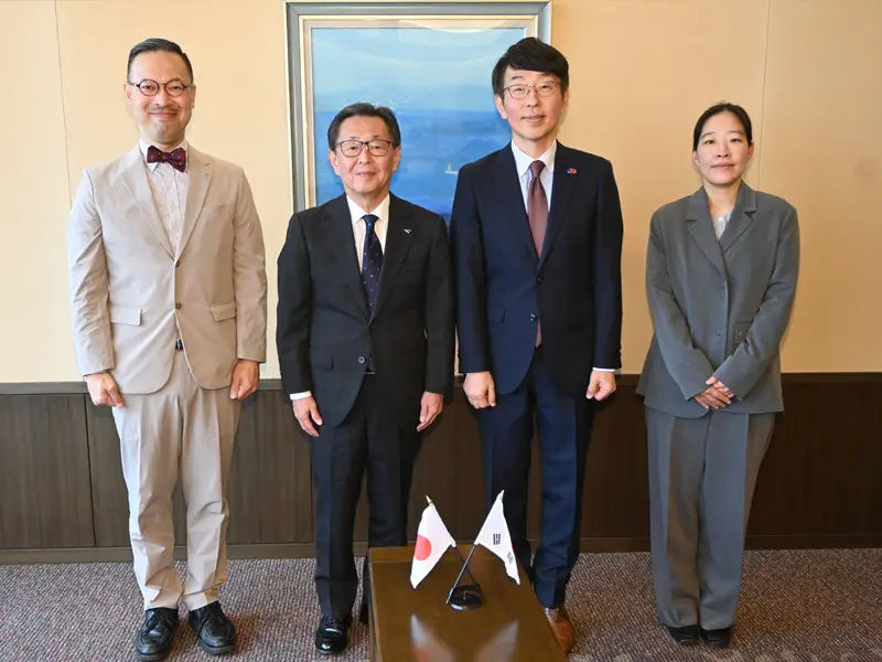共通教育科目の1コマとなる講義に先立ち、李総領事は千孝貞(チョン・ヒョジョン)副領事とともに同センターの岡部芳彦所長の案内で備酒伸彦学長を表敬訪問し、備酒学長が最近韓国を訪問して感じたICT技術の発展ぶりや食文化の違い、建築物の面白さ、少子高齢化など日韓が共通して取り組まなければならない社会課題などについて懇談しました。