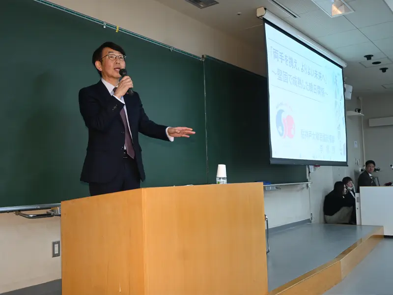 李総領事は東京の大使館で2度勤務した経験があり、流ちょうな日本語で「両手を携え、よりよい未来へ~堅固で成熟した韓日関係へ」と題して講義しました。大使館や全国に9カ所ある総領事館の役割についての説明から始まり、江戸時代、約200年間に12回も日本を訪れた朝鮮通信使との善隣友好や、日本による朝鮮半島の植民地支配などに見られる両国の歴史を「友好親善と痛みが共存する関係」と表現しました。