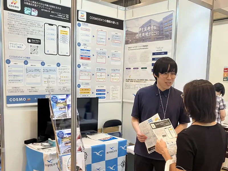 また、同学部の大庭潤平教授と倉昂輝研究員は、「子どもと家族を主役に」と題して、作業療法士による支援のもと実施する、目標達成支援アプリケーションの開発について、ポスター展示を行い、ブース内では2日間にわたって、大学院総合リハビリテ-ション学研究科についても紹介しました。