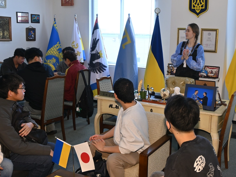 在神戸ウクライナ名誉領事館を姫路市立琴丘高校生が見学に訪れ、ウクライナからの交換留学生らも祖国について説明しました