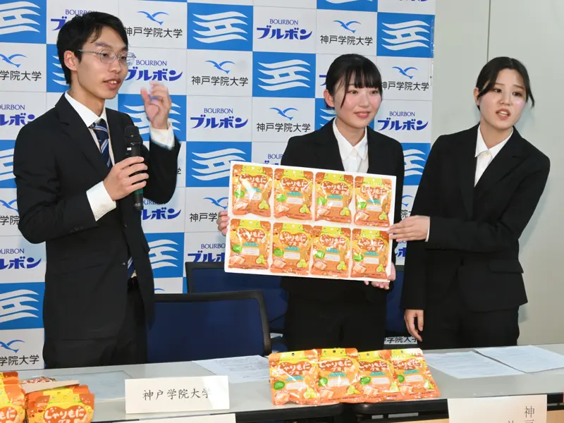 本学学生が大手製菓会社「ブルボン」(本社・新潟県柏崎市)とともに、売れる仕掛けづくり、付加価値の高いマーケティングの開発に取り組んで商品開発を行っています。2024年には阪神・淡路大震災から30年を迎えて、経営学部・辻ゼミナールの学生が、兵庫県の協力も得て、「しゃりもにグミ 想いをつなぐシトラスミックス味」を考案し、パッケージにメッセージを入れて全国販売しました。同社とのコラボ商品の開発は4件目です。2017年には神戸開港150周年を記念して「白のアルフォート ミニチョコレート塩バニラ」、2018年には兵庫県政150周年を記念して「神戸しっとりチーズケーキ」、2019年には「地域創生に係る包括連携協定」に基づく防災・減災の取り組みの一つとして「ひょうごBOSAI天然水」を共同開発して商品化されました。