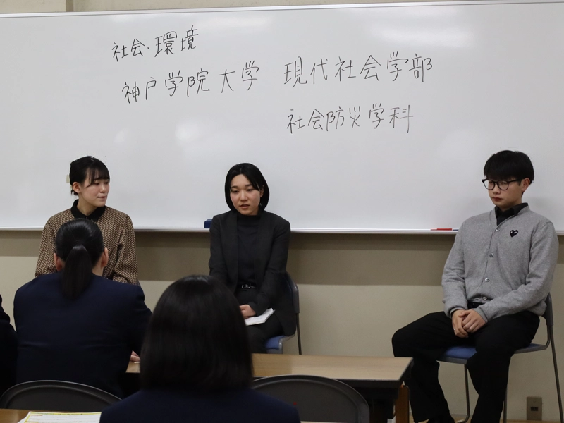 神戸市内の高等学校に通う生徒を対象に、神戸学院大学、神戸常盤大学、関西国際大学の3大学から、現役大学生と卒業生が登壇し、それぞれの学問分野や仕事について語り合いました。その姿を通じ、高校生に「これからの学びが将来どう生きるのか」を実感してもらい、自分自身のキャリアを前向きに描く一歩となることを目的として実施しました。本学からは、法学部、現代社会学部、総合リハビリテーション学部、栄養学部から学生12人、それぞれの学部の卒業生4人、計16人が参加して登壇しました。