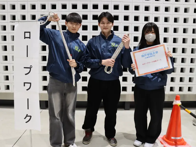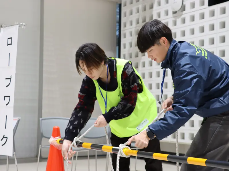 午後からは、ブースを訪れた学生、教職員に対し、ロープワークの方法として、もやい結び、本結び、巻き結び等をレクチャーしました。体験した学生らは「覚えれば簡単に結べるものばかりで、災害時以外にも役立ちそう」と感想を述べました。