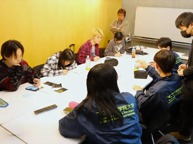 訓練当日の午前中は本学と東北福祉大学が合同でディスカッションを行い「防災訓練へ参加する学生をどのように増やすか」をテーマに話し合いました。学生からは「非常食の配布に留まらず、試食体験する」「防災に取り組む学外の団体を積極的に呼び込み事前広報を行う」など、学生目線のアイデアが集まりました。