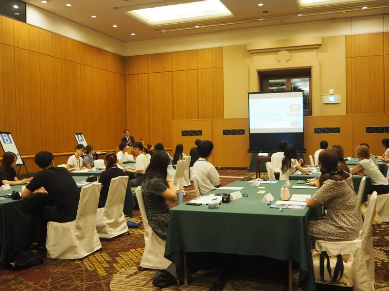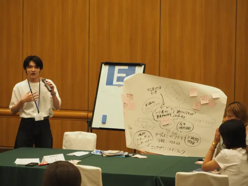 その後、ホテルのレストランでグループごとにランチバイキングを楽しんだあと、午後のプログラムがスタート。本プログラムの課題コーディネーターを担当している一般社団法人SAZARE の江副真文代表理事が登壇し、「六甲アイランドで新しい彩りコトをつくろう」をテーマにグループワークを行いました。まず、個人ワークで思いついたアイデアを付箋に書き出し、その後グループごとにアイデアをまとめて発表しました。「ホテルの前の通りにイルミネーションを設置するのはどうか」「クリスマスマーケットを開催するのはどうか」など、大学生らしいさまざまな意見が挙がり、今後の施策立案に向けた導入となりました。