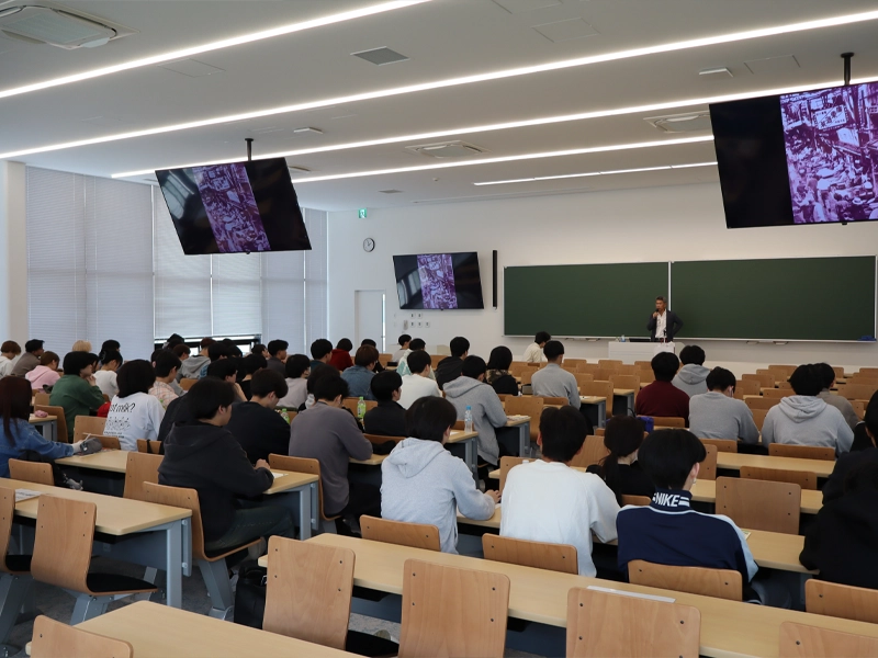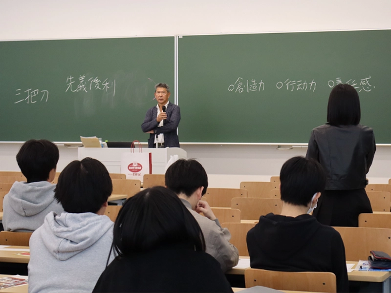 また、「困難の懐(ふところ)に飛び込め」という考え方や、多様な人材を巻き込み、人が守るべき義(道徳)をまず大切にし、利益はその次で良いとする「先義後利(せんぎこうり)」の精神で街のブランドを築く大切さについて説明。学生にとって将来の仕事への向き合い方について考える貴重な機会となりました。