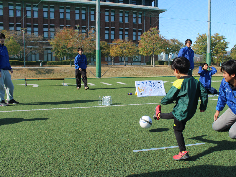 クリニック終了後には、スポーツサイエンス・ユニットの学生によるプレイパークが実施されました。サッカーゴールに配置された的にボールを当てるキックターゲット、キックボウリング等、5つのアトラクションを一緒に楽しみました。全てのブースを回った子どもたちはお菓子と神戸学院大学オリジナルグッズをもらい、大喜びしていました。