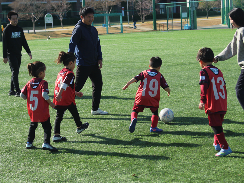 ヴィッセル神戸スクールコーチによる親子サッカークリニックは年中・年長(4〜5歳)と小学1・2年生に分かれて行いました。相手にボールをとられないようボールを体の周りで動かすボールフィーリングや、顔をあげてドリブルができるようジャンケンをしながらドリブルする練習、くるぶしの下で押し出すように蹴ることを意識づけるパス練習、親子での1vs1を行いました。子どもたちはスクールコーチのアドバイスに耳を傾け、すぐ実践できるよう、お手本を思い出しながら、一生懸命プレーしました。