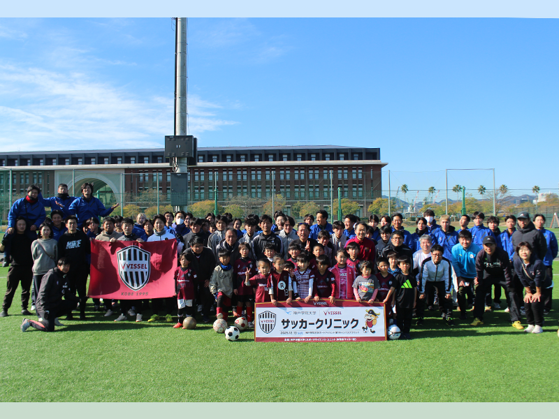 「スポーツフェスタ2025 神戸学院大学×ヴィッセル神戸親子サッカークリニック」を12月13日に、ポートアイランド第1キャンパスのグラウンドで開催し、年中・年長(4〜5歳)の幼児と小学1・2年生の子どもたち、保護者17組が参加ました。