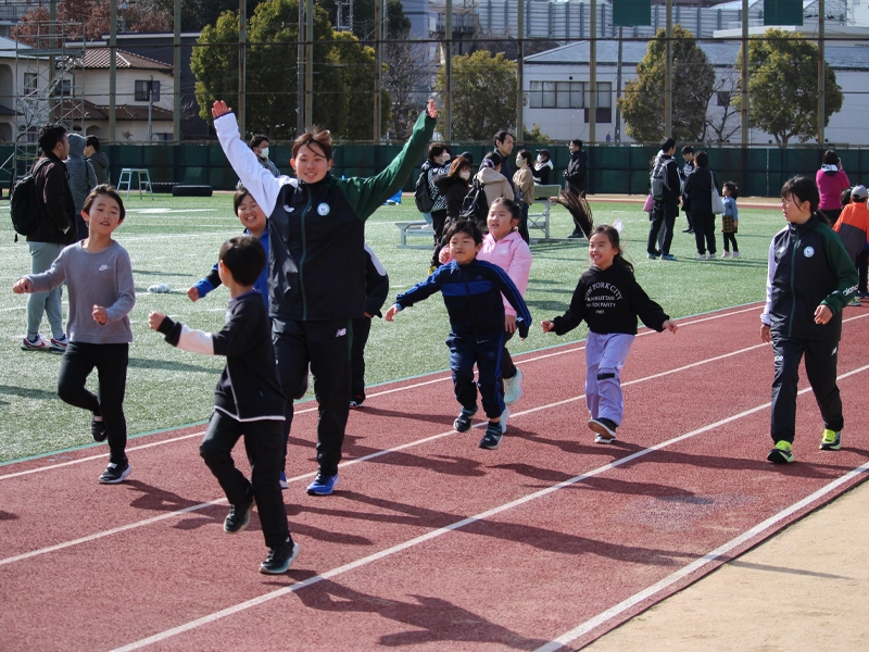 運営には、司会を務めたアメリカンフットボール部、女子駅伝競走部、ラクロス部の学生をはじめ、多くの学生スタッフが携わりました。司会を務めた女子駅伝競走部の大河内碧彩さん(人文学部・スポーツサイエンス・ユニット2年次生)は、「スポーツは健康な身体を作るだけでなく、多くの人と交流する貴重な機会。今日の体験を通じて、スポーツの喜びを感じてほしい」と語り、競技の合間には学生が子どもたちに寄り添ってアドバイスを送る姿が随所で見られました。