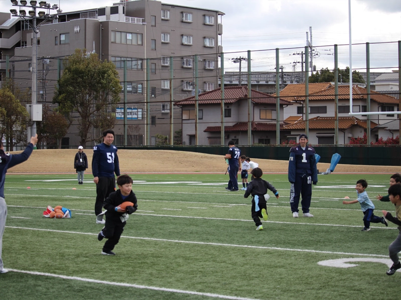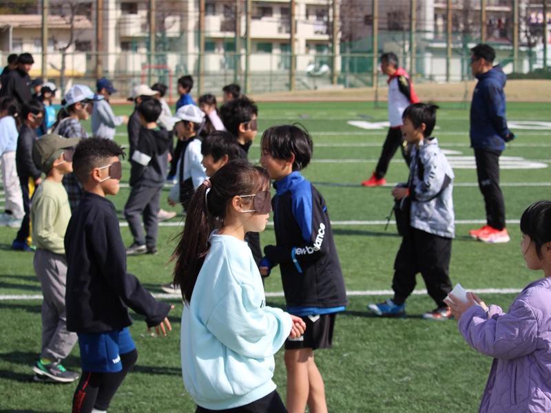 T&F.net KOBEの野口研治代表が講師を務め、男子陸上競技部がサポートを行いました。子どもたちは2人1組となり、1人がアイマスクを着用し視覚障害者の役割を担い、もう1人が「伴走者」の役割を体験。相手を思いやる気持ちや、声でのコミュニケーションの大切さを学びました。 - フラッグフットボール(アメリカンフットボール部)