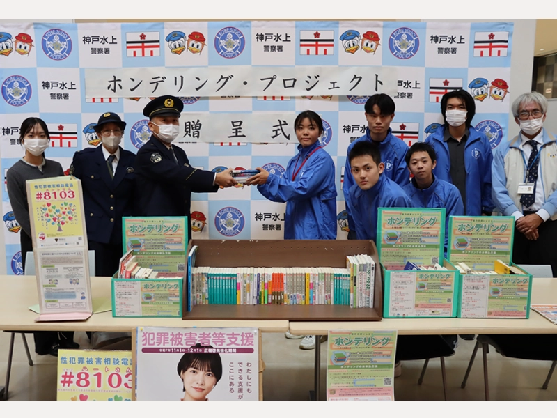最後に学生から警察への本の贈呈式を執り行い、ポーアイ・セーフティタウン・コミュニティから神戸水上警察署へ、収集したすべての本を寄贈しました。寄贈した本は、神戸水上警察署から公益社団法人全国被害者支援ネットワークへ引き渡され、犯罪被害に遭った方の生活支援や、カウンセリングなどの心理的支援に役立てられます。