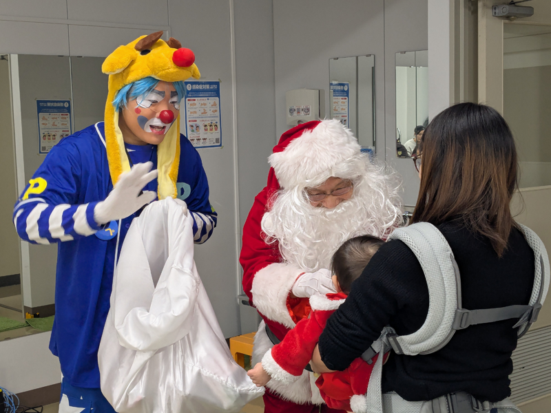 プログラムの最後には、特別ゲストとしてサンタとトナカイに扮した心理学部の清水寛之教授と岡村心平講師が登場し、子どもたちにお菓子のプレゼントを手渡しました。会場は終始、笑顔と温かな雰囲気に包まれていました。
