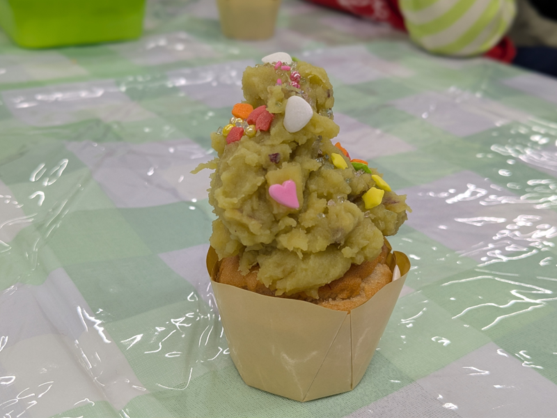 続いて、クリスマス・スイーツ作りを実施しました。米粉のバナナマフィンに、サツマイモ抹茶クリームや豆乳ホイップを使って、サンタやトナカイ、クリスマスツリーを表現し、親子でデコレーションを楽しみました。完成したスイーツは、その場で親子一緒に味わいました。